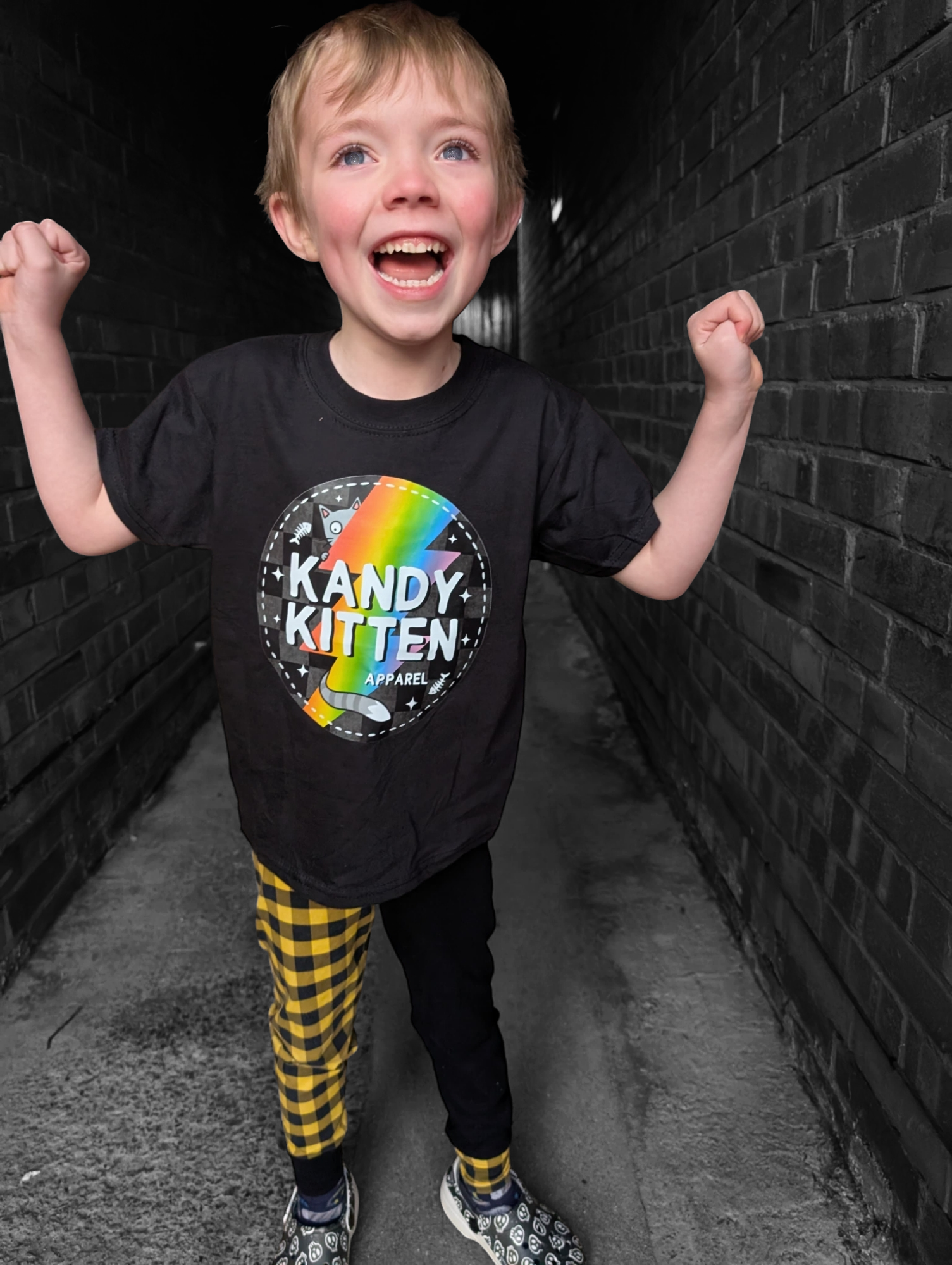 100% cotton black t-shirt with full colour Kandy logo. Hand finished.